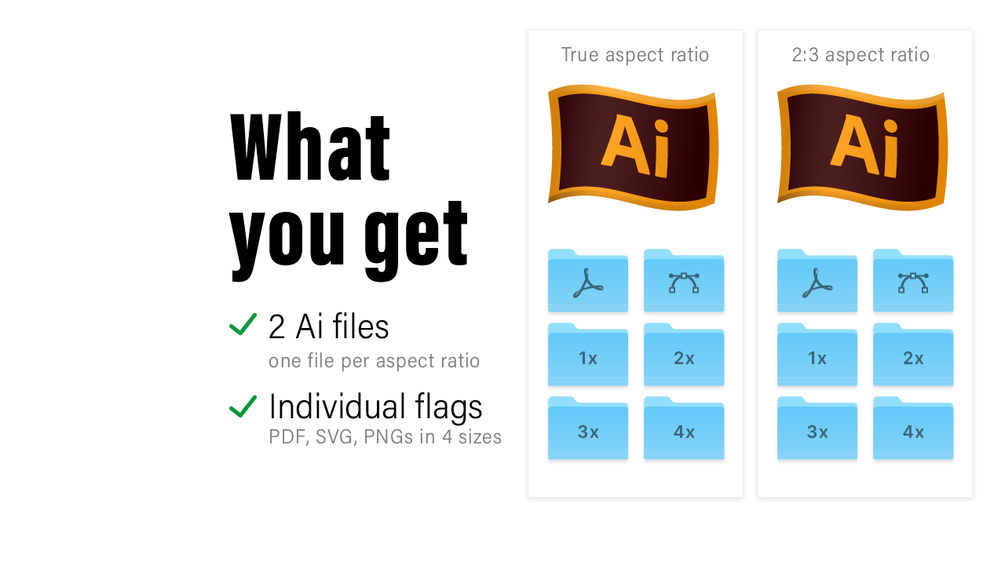 1 .ai file per aspect ratio (true and 2:3) + each flag as a PDF, SVG, & PNG (4 sizes)